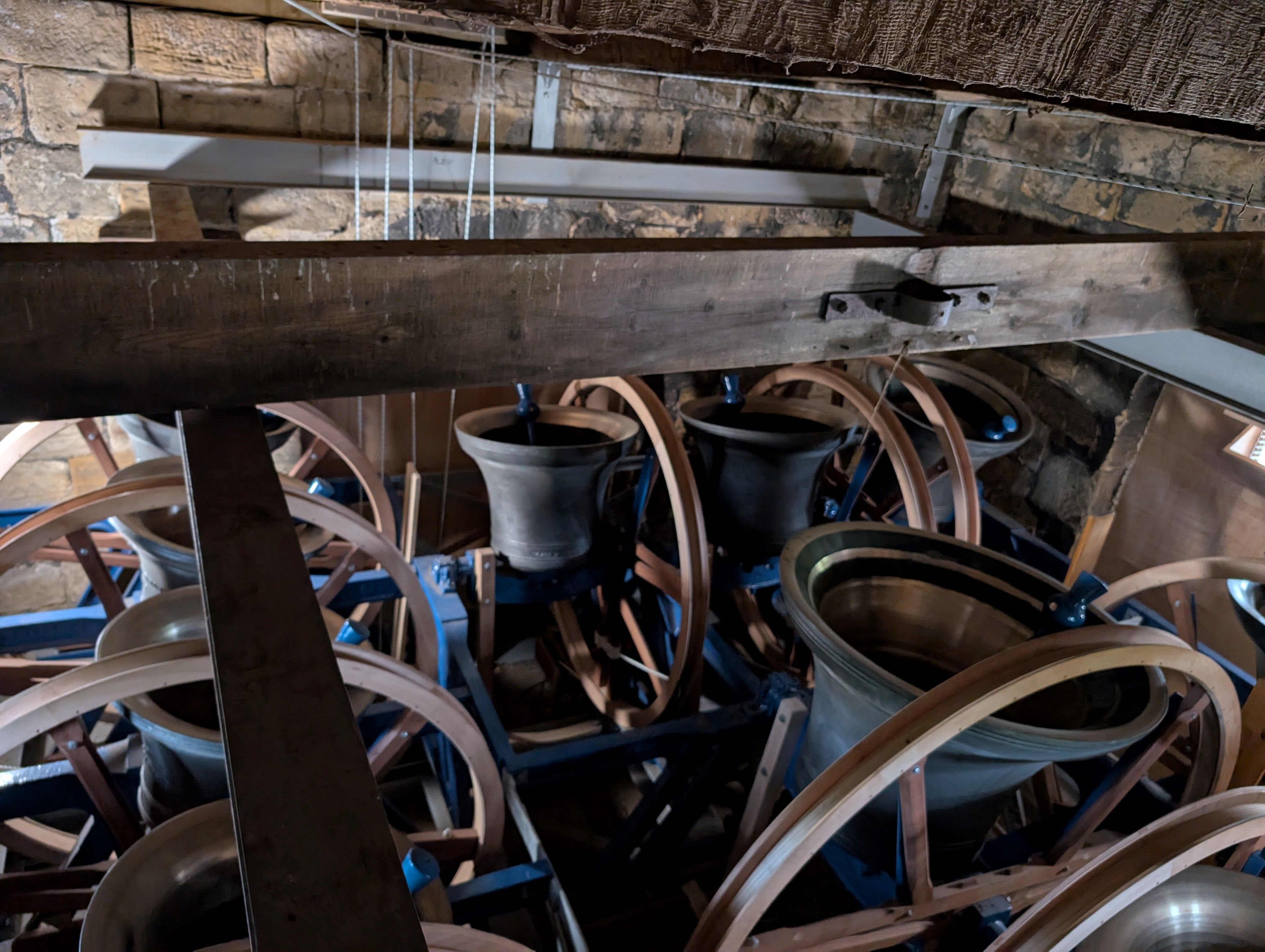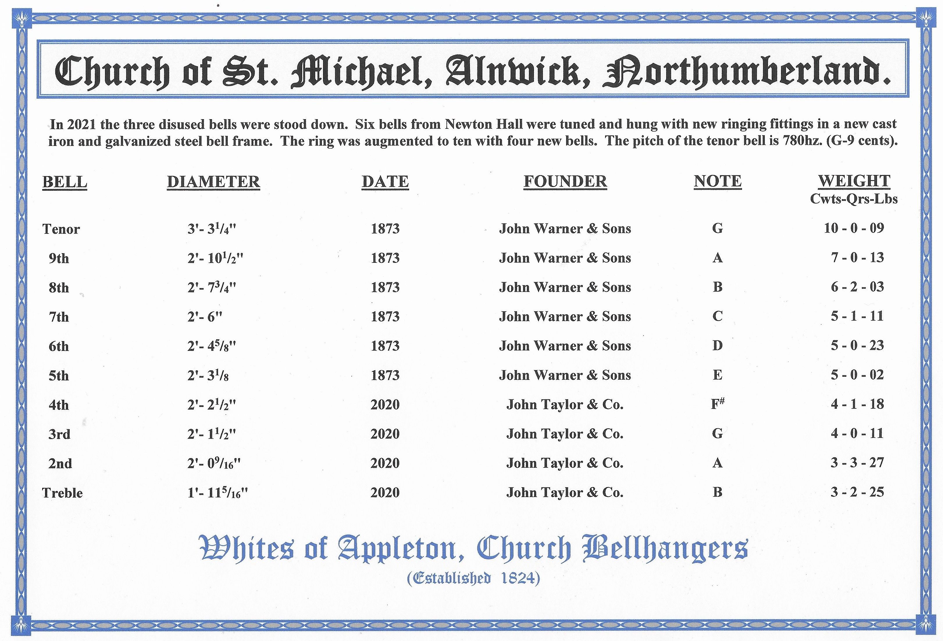 The medieval tower of St. Michael’s contains a fine peal of 10 bells installed by Whites of Appleton during the restoration of the tower in 2021. The peal comprises 6 recycled bells from the church of St. James, Newton (near Corbridge in the Tyne valley) and 4 new bells cast by Taylors of Loughborough.